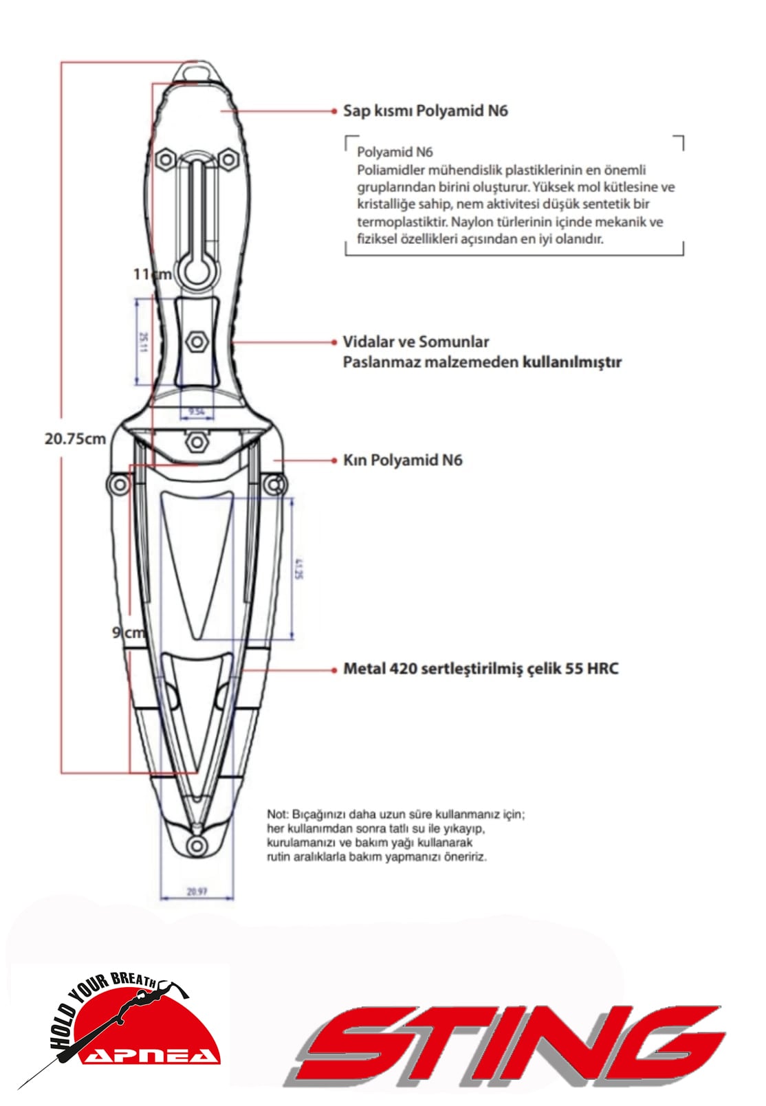 ✳ Apnea Sting Dalış Bıçağı ,tüm su sporlarında güvenli kullanım ve yüksek performans sunmak üzere tasarlanmıştır. Keskin ve dayanıklı yapısı, suda acil durumlarda hızlı ve kontrollü müdahale imkânı sağlar.